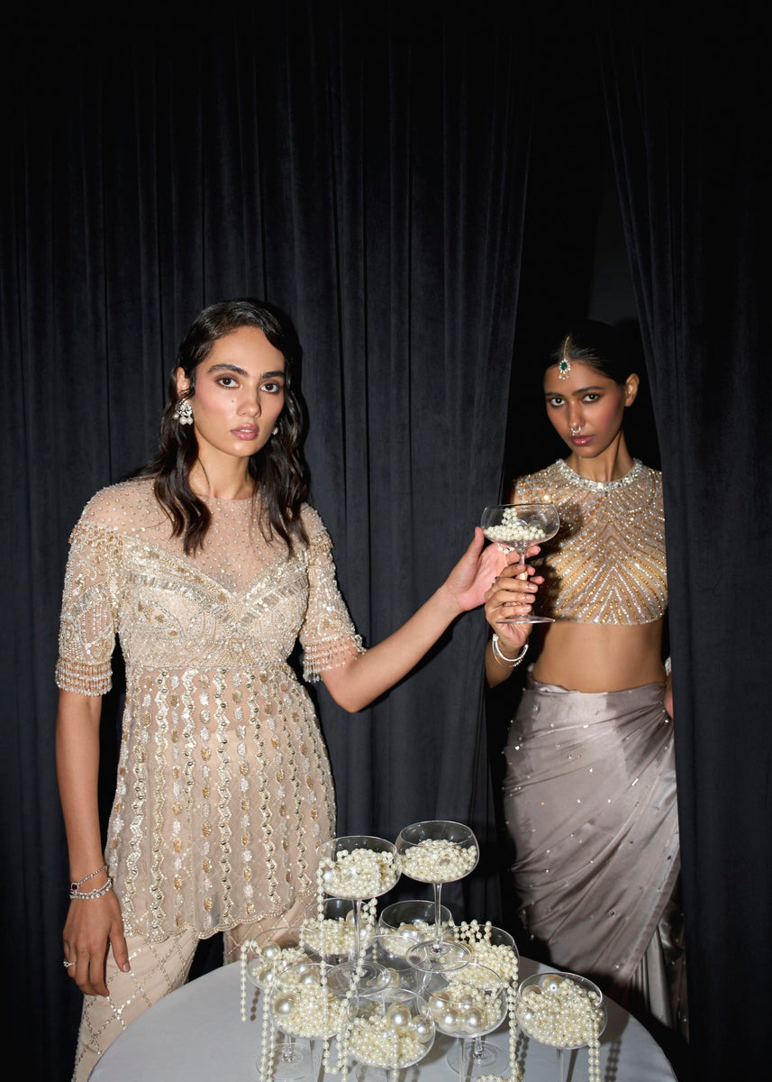 The kali pants, designed for graceful movement and dramatic flair, are finished with an ornate border that adds a regal touch. Perfect for modern festive occasions, cocktail nights, or contemporary wedding functions, this set brings together bold elegance and celestial charm in every detail.