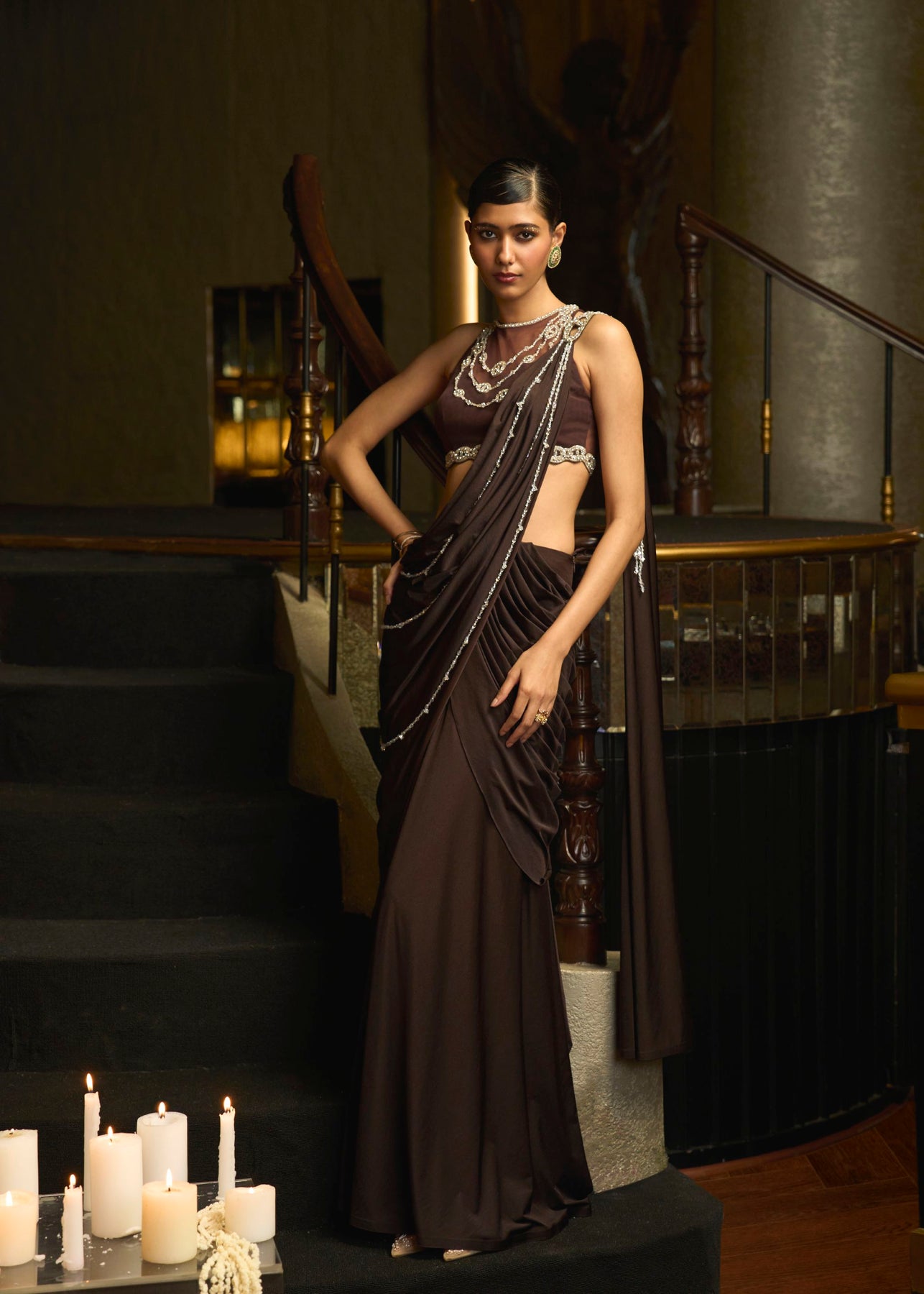 A study in sculpted elegance, Neer reimagines classic drapery through a contemporary lens. Crafted in a deep cocoa hue, this pre-draped saree flows effortlessly with soft pleats that contour the body, creating a refined and elongated silhouette.