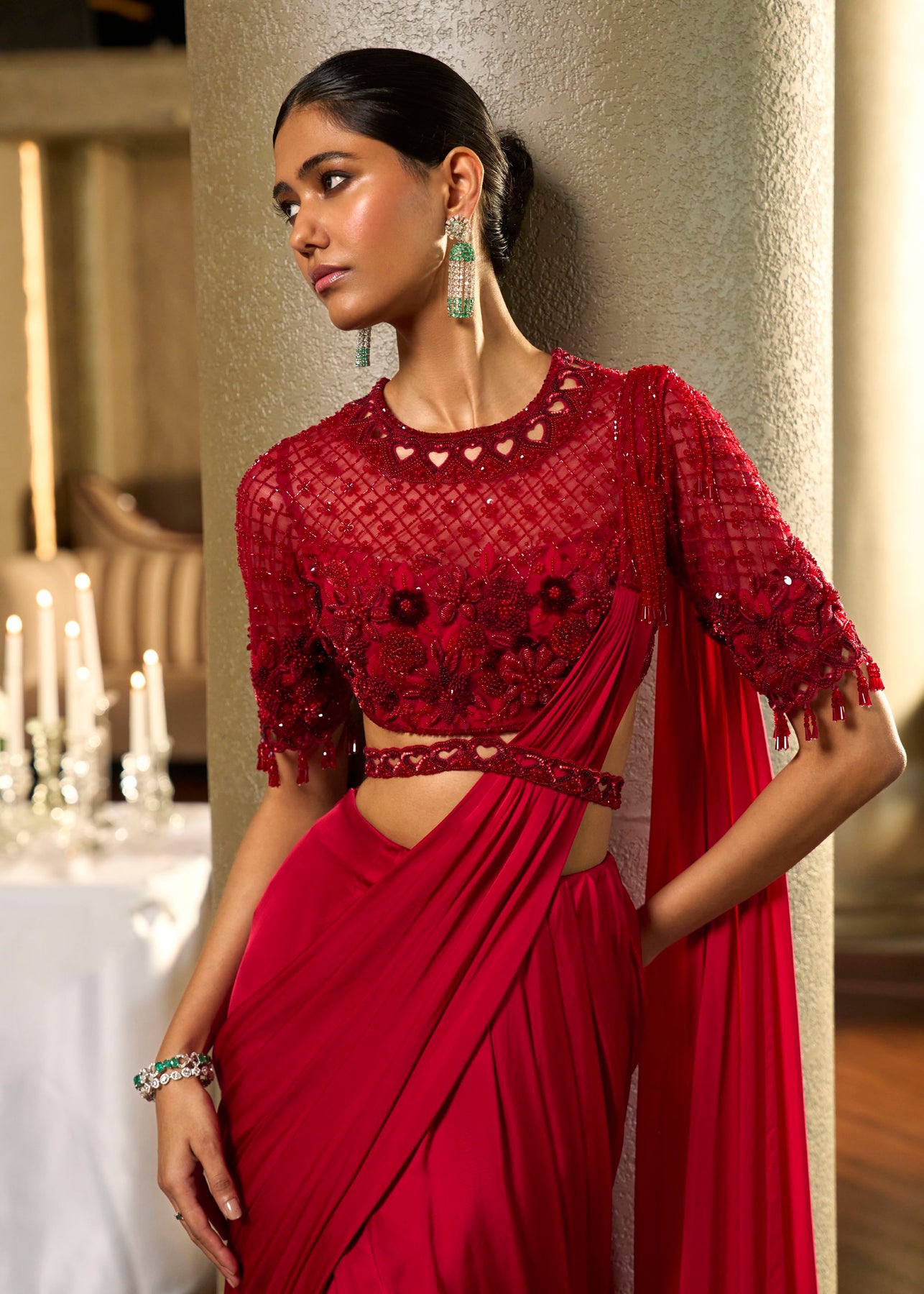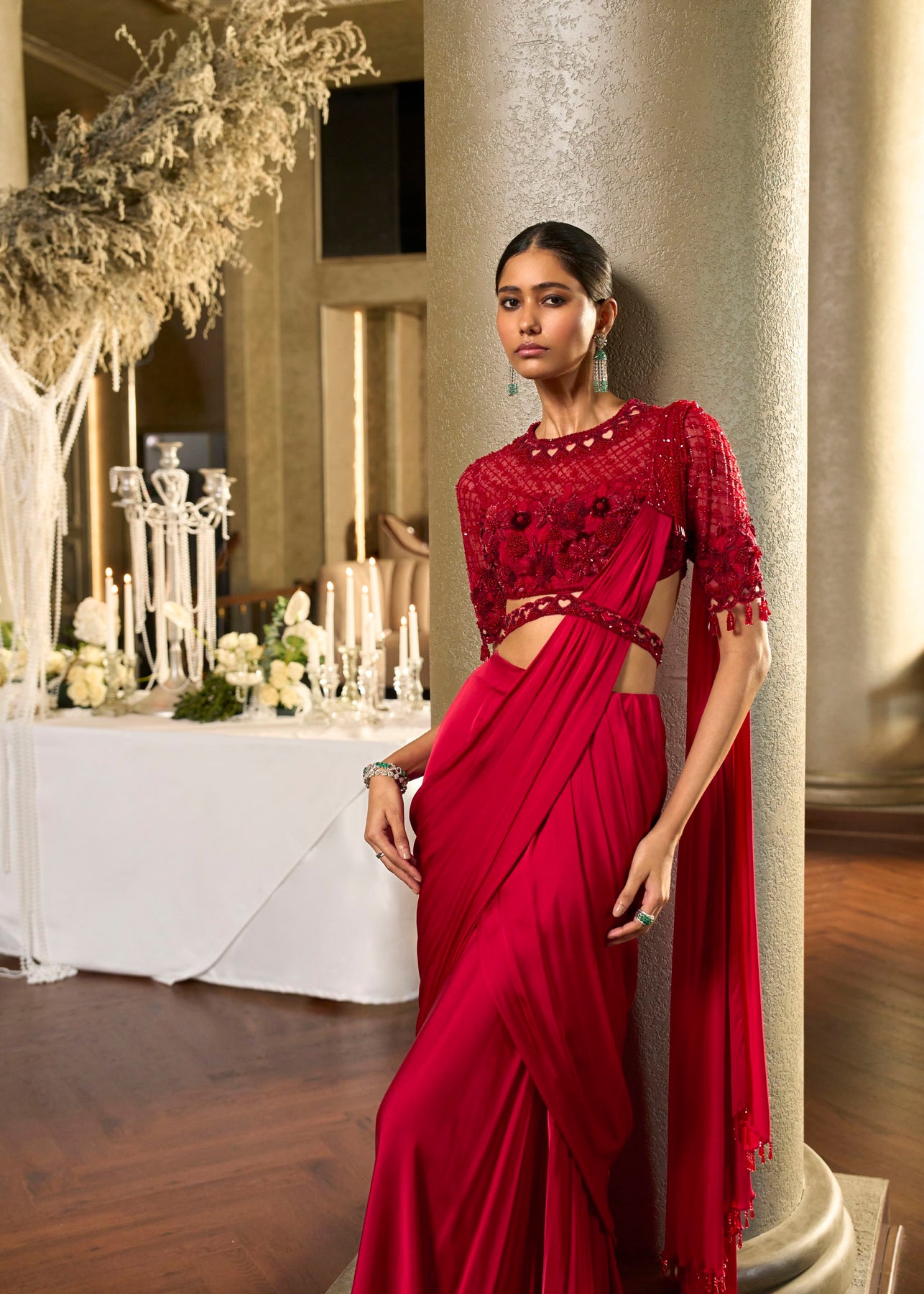 A contemporary take on classic drapery, Luvine features a fluid pre-draped saree paired with an intricately embroidered apliqué blouse. Designed to sculpt the silhouette with effortless elegance, this look balances modern cuts with timeless craftsmanship.